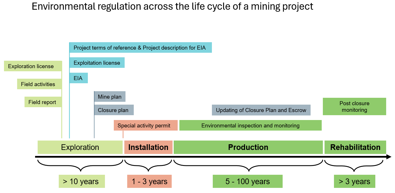 The illustration below provides an overview of the process from an exploration permit, all the way to decommissioning and final monitoring.